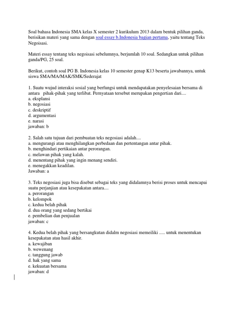 Soal Uraian Dan Jawaban Teks Negosiasi Contoh soal essay bahasa indonesia kelas x semester 2 kurikulum 2013 beserta jawaban Soal Dan Jawaban Teks Negosiasi Kelas 10 By Posted on July 26 2020. Negosiasi adalah suatu wujud interaksi sosial yang fungsinya guna mendapatkan penyelesaian bersama diantara pihak-pihak yang terlibat RSJ - Contoh Soal PPKN kelas 10 dan Jawabannya Bab 3 Kewenangan Lembaga-Lembaga Negara Menurut UUD Negara Republik Indonesia Tahun 1945 PPKn Kelas X SMASMKMA. Jawab Soal Essay Bahasa Indonesia Kelas 10 tentang Teks Eksposisi.