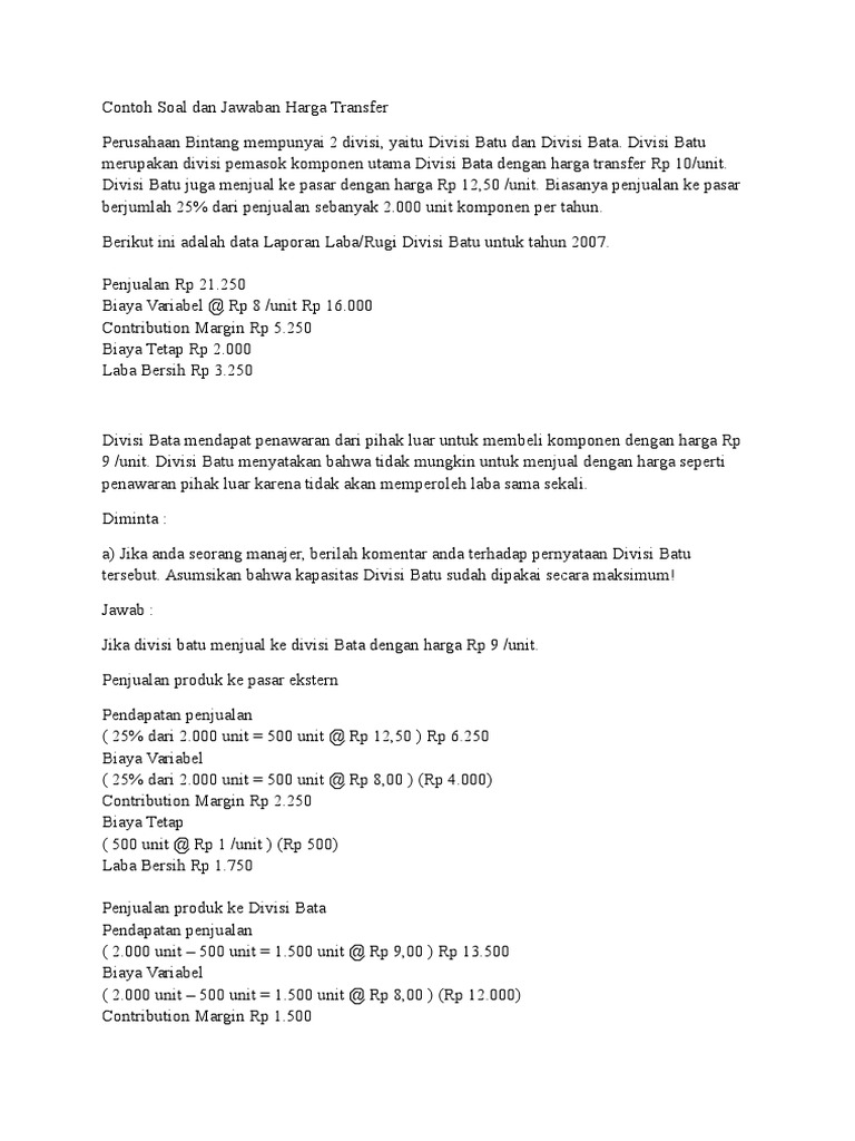 Soal dan jawaban harga transfer. Divisi batu juga menjual ke pasar dengan harga rp 12 50 unit. Download Contoh Soal Dan Jawaban Harga Transfer PDF 2000 MB - SamPDF Unduh Contoh Soal Dan Jawaban Harga Transfer PDF secara gratis di SamPDF. Memiliki dua divisi a dan b yang di bentuk sebagai pusat laba.