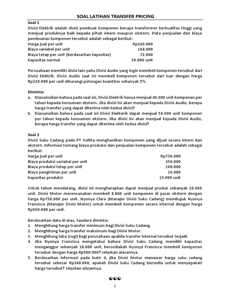 Selain itu perubahan otoritas dalam menangani praktik transfer pricing juga terlihat pasca dirilisnya SE-15PJ2018 tentang Kebijakan Pemeriksaan. Download Contoh Soal Dan Jawaban Konsep Umum Penentuan Harga Transfer Pt PDF 1800 MB - SamPDF Muat turun. Mengevaluasi kinerja anak atau cabang perusahaan mancanegara.