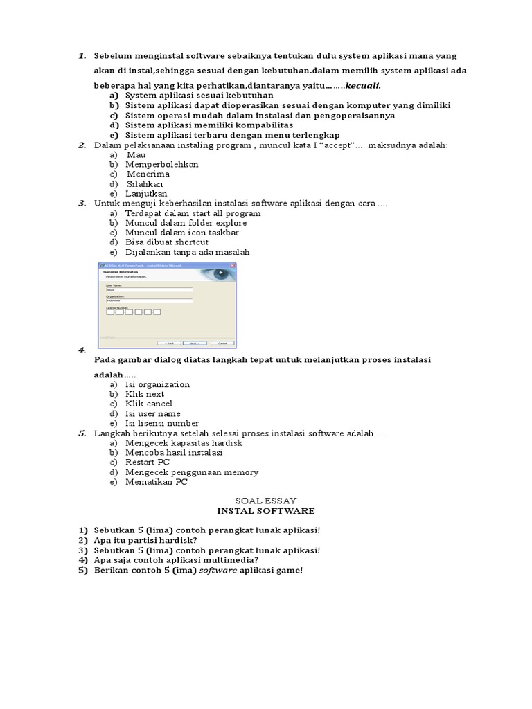 Soal instalasi software beserta jawabannya. 20201001 Soal essay instalasi software soal melakukan instalasi software 1. Layer apakah yang memilih dan menentukan ketersediaan partner komunikasi te. 3 dan 6 E.