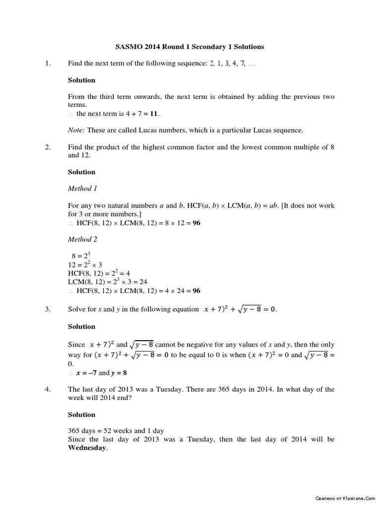 Sasmo 2014 Round 1 Secondary 1 Solutions Elementary Mathematics Teaching Mathematics
